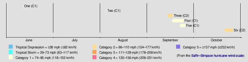 The 1858 Atlantic hurricane season was one of only three Atlantic hurricane seasons on record in which every tropical cyclone intensified into a hurricane (the others were in 1852 and 1884).[1] The first hurricane was first observed over the northwestern Caribbean Sea on June 12. The sixth and final storm was last noted on October 26. These dates fall within the period with the most tropical cyclone activity in the Atlantic. Three tropical cyclones during the season existed simultaneously. Two of the cyclones have only a single known point in its track due to a sparsity of data. Operationally, another tropical cyclone was believed to have existed over the eastern Atlantic between September 17 and September 18, but HURDAT the official Atlantic hurricane database excludes this system. However, in the absence of modern satellite and other remote-sensing technologies, only cyclones that affected populated land areas or encountered ships at sea are currently known, so the actual total could be higher. An undercount bias of zero to four tropical cyclones per year between 1886 and 1910 has been estimated.[2] Of the six known 1858 Atlantic cyclones, five were first documented in 1995 by Jose Fernandez-Partagas and Henry Diaz.[3]