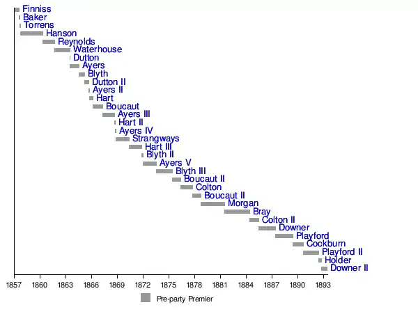 Since the inaugural 1857 election, no parties or solid groupings had been formed, which resulted in frequent changes of the Premier. If for any reason the incumbent Premier of South Australia lost sufficient support through a successful motion of no confidence at any time on the floor of the house, he would tender his resignation to the Governor of South Australia, which would result in another member deemed to have the support of the House of Assembly being sworn in by the Governor as the next Premier.