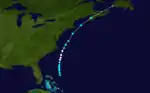 A tropical storm developed about 820 mi (1,320 km) west-southwest of the Cabo Verde Islands early on September 1.[5] On September 3, the Spanish brig Engracia became the first ship to encounter the storm.[4] That day, the cyclone intensified into a Category 1 hurricane while moving northwestward. The hurricane peaked with maximum sustained winds of 80 mph (130 km/h).[5] Early on September 6, the steamship Caribbean observed a barometric pressure of 982 mbar (29.0 inHg),[4] the lowest in relation to the storm. On September 7, the cyclone began moving northward and then northeastward later that day. The storm was last noted by the Knoch Train late on September 10,[4] about 450 mi (720 km) east of Newfoundland.[5]