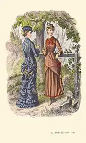 - Fashions from La Mode Illustrée show dresses made of contrasting fabrics worn with "shelf" bustles and opera-length gloves, 1887.