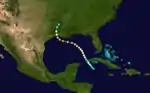 Little more than a day after the dissipation of the previous hurricane, a broad area of low pressure over the western Caribbean Sea developed into a tropical storm while centered about 180 miles (290 km) east-southeast of Punta Allen, Quintana Roo, Mexico.[4][12] Over the next two days, the storm meandered toward and through the Yucatán Channel, gradually intensifying as it proceeded to the north-northwest and north. Late on June 18, the system attained hurricane status off the western tip of Pinar del Río Province, Cuba. The following day, the cyclone turned to the north-northeast, producing "severe gales" (47–54 mph, 76–87 km/h) over the waters off Cuba and Jamaica, as reported by ships.[14] At 00:00 UTC on June 20, the storm reached its peak intensity of 100 mph (160 km/h), and shortly afterward its forward speed accelerated. At 11:00 UTC on June 21, the cyclone made landfall a short distance east of St. Marks, Florida, as a Category 2 hurricane.[4] The storm gradually decreased in intensity over the next day and a half as it crossed the Southeastern and Mid-Atlantic states. By 18:00 UTC on June 23, the system passed about 70 miles (110 km) southeast of New York City and curved to the east before dissipating a day later.[4]