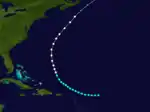 After entering the open Atlantic, the cyclone strengthened and likely peaked with winds of 100 mph (155 km/h) on September 14, equivalent to a Category 2 hurricane. The storm may have remained at this intensity for nearly a week, falling back to Category 1 hurricane status on September 20 as it began turning northwestward. By September 22, the hurricane curved northeastward, several hours before falling to tropical storm intensity. The cyclone then weakened to a tropical depression late on September 23 and was last noted about 575 mi (925 km) west-southwest of Flores Island in the Azores.[1]