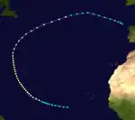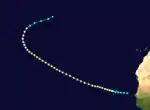 Observations indicate the presence of a tropical storm on September 12 about 140 mi (225 km) west-northwest of Dakar, Senegal. The storm moved west-northwestward through the Capo Verde Islands without making landfall and intensified into a hurricane on the following day roughly halfway between São Nicolau and Santiago.[1] While crossing through the archipelago, storm surge and abnormally high tides caused several vessels to flounder. On land, the hurricane destroyed many dwellings, severely damaged plantations, and killed "a quantity of cattle", according to The Times.[5] Aside from this system, Hurricane Fred in 2015 became the only other cyclone to pass through the Capo Verde Islands as a hurricane.[6]