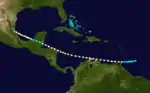Observations suggest the presence of a tropical storm about 290 mi (470 km) east of Tobago on October 5.[2] The storm moved generally westward and intensified into a hurricane as it passed just south of the island late the following day. Remaining over the far southern Caribbean, the hurricane passed near the ABC islands and then struck Paraguaná in Venezuela as a Category 2 hurricane with winds of 100 mph (155 km/h) on October 8. After briefly re-emerging into the Caribbean, the cyclone made landfall on the Guajira Peninsula several hours later. Thereafter, the system moved in a more west-northwesterly direction and then struck near Cabo Gracias a Dios on the NicaraguaHonduras border on October 11. The storm weakened to a Category 1 hurricane while crossing Honduras, but re-strengthened into a Category 2 hurricane on October 12 after re-emerging into the Caribbean. Around 18:00 UTC that day, the hurricane made landfall just south of Belize City, British Honduras. Rapidly weakening to a tropical storm, the system soon re-strengthened into a hurricane after emerging into the Bay of Campeche about 24 hours later. The storm re-intensified into a Category 2 hurricane, but weakened to a Category 1 prior to making landfall south of Tampico, Tamaulipas, late on October 15. High terrain over eastern Mexico caused the system to dissipate early the next day.[1]