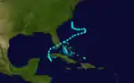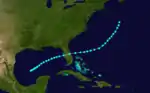 The first tropical storm developed about 45 mi (70 km) south of Isla de la Juventud on June 9. Initially moving northwestward, the storm made landfall later that day on the south coast of Pinar del Río Province in Cuba. The storm recurved northward and entered the Gulf of Mexico early the following morning, where it intensified and peaked with maximum sustained winds of 50 mph (85 km/h). Around that time, it turned to the northeast and made landfall at 23:00 UTC on June 10 in northern Monroe County, Florida, at the same intensity. The cyclone crossed Florida and emerged into the Atlantic Ocean near modern-day Deerfield Beach early the following day. Thereafter, the system headed out to sea for a few days, before re-approaching the Southeastern United States. Late on June 16, it was last noted about 80 mi (130 km) south-southeast of Cape Lookout, North Carolina.[1]