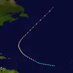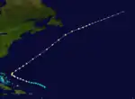 A tropical storm was first observed on August 30 near 14°N 38°W / 14°N 38°W / 14; -38, which is approximately 700 mi (1,125 km) west-southwest of Cape Verde.[1] The system slowed intensified while moving generally west-northwestward and then northwestward by September 1. Early on the following day, the storm strengthened into a hurricane. Around 18:00 UTC on September 3, the cyclone intensified into a Category 2 hurricane on the modern-day Saffir–Simpson scale and soon turned north-northwestward. The hurricane re-curved again by early on September 6 and reached Category 3 hurricane intensity later that day, peaking with winds of 115 mph (185 km/h).[2] Several steamships encountered the hurricane on September 8 and September 9, including the Othello, which observed a barometric pressure of 948 mbar (28.0 inHg),[1] the lowest known pressure in relation to the storm.[2] Additionally, the schooner Origin became caught in the storm, which damaged several parts of the ship and threw one person overboard, who drowned.[5] The hurricane weakened and lost tropical characteristics as it accelerated northeastward, transitioning into an extratropical cyclone about 500 mi (805 km) southeast of Greenland late on September 9.[2]