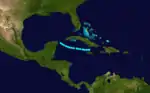 According to reanalysis by José Fernández Partagás in 1996, this system may have formed as early as June 4. However, Partagás elected to retain Simón Sarasola's 1928 narrative on this cyclone, indicating development about halfway between Cuba and Jamaica early on June 6.[1] The cyclone remained weak, peaking with maximum sustained winds of 40 mph (65 km/h) as it headed generally west-northwestward. Late on June 9, the storm was last noted near northeastern tip of the Yucatán Peninsula.[2] Flooding occurred in Cuba between Havana and Oriente Province, with the worst impacts in Santa Clara.[1]