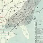 On September 18 a tropical storm was first observed and lasted until September 30. It formed to the east-southeast of the Lesser Antilles. It hit the Lesser Antilles and then the Greater Antilles, later curving north and striking near Punta Rassa, Florida, with winds up to 105 mph (169 km/h). It then went back out to sea and hit South Carolina, tracked through North Carolina, and then made its way out to sea, where it eventually dissipated. On September 20, as the storm passed through the Lesser Antilles, it produced heavy rains and high winds over several islands. On Martinique, high winds and continuous, torrential rains impacted the island. Despite the intensity of the storm, there were no reports of damage in the Lesser Antilles. In Hispaniola, more than 500 homes and two churches were destroyed; numerous other structures sustained damage, mainly having their roofs blown off. The cyclone produced heavy rainfall in Florida, including 13.78 inches (350.01 mm) over a 54-hour period at Tampa; at Titusville, 7.72 inches (196.09 mm) fell in two days. Jacksonville registered a storm total of 11.11 inches (282.19 mm).[6] In southeast Florida, a bridge on the Lake Worth Lagoon was swept away[7] and thousands of dead fish beached at Jupiter,[8] but otherwise only gale-force winds and occurred and damage was insignificant.[9] The ship Jella was stranded at Hillsboro Inlet and the Emily II sank off Key West with a loss of all her crew. Many wine caskets and other debris were found on the beaches between the New River and the Lake Worth Lagoon.[10] In all, the cyclone was responsible for an estimated 200 deaths.
