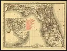 Several cigar factories were wrecked in Tampa. The storm also destroyed many smaller homes and buildings, as well as a church and hotel. Damage to buildings alone in Tampa reached approximately $50,000. Watercraft in the St. Johns River at Palatka suffered significant impact and 12 wharves between Palatka and Green Cove Springs disappeared. In St. Augustine, storm surge and abnormally high tides overtopped the seawalls and "made rivers of the streets", according to The Times-Union. Water entered many homes and the Ponce de Leon Hotel.[15] In Jacksonville, strong winds and heavy rainfall deroofed the city's largest hotel, the Everett Hotel. The storm also destroyed an unfinished railroad station and two homes.[16] Nearby, abnormally high tides caused extensive damage in Mayport and Pablo Beach, with all of the docks and wharves destroyed at the former.[17] Throughout the state, a loss of about 20% of orange crops occurred. Overall, damage in Florida exceeded $1 million.[15]