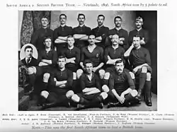 Hammond's squad was considered to have an outstanding pack but be comparatively weak in the three-quarter line. Louis Magee and England full-back Fred Byrne were the stars of the backline, but it was a forward eight inspired by Tom Crean that laid the foundations for the team's success.[1] Hammond, was injured early in the tour and it was Crean who took over the role in his absence. The team's only draw came in an early game against Western Province. Before the game, the new Prime Minister of the colony, Sir Gordon Sprigg, insisted on entertaining the tour party in the grand manner of his predecessor, Cecil Rhodes. Crean, captain for the day, sensing a ruse, sternly warned his players to limit their lunchtime consumption to just four tumblers of champagne, but it would appear some lost count. They escaped with a lucky 0–0 draw, but in a later game a much more sober team avenged the result 32–0, their biggest win of the tour.[5] Facing a South Africa side captained by Ferdie Aston, brother of Randolph Aston, a member of the 1891 British team, the tourists dominated at forward throughout but could only score two tries in an 8–0 win. South Africa scored their first tries in international rugby in the second Test but still went down 17–8. In the third, the hosts actually led but were overhauled to go down 9–3, with Byrne kicking a conversion and a drop goal to set a record. He remained the only player to score 100 points while on tour in South Africa until 1960 when Don Clarke of New Zealand beat his record. South Africa improved, however, and won the final test 5–0 at Newlands. It was the previously flawless Byrne who lost possession to spark the attack from which Alf Larard scored the game's only try.[1][6]