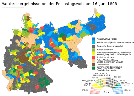 Federal elections were held in Germany on 16 June 1898.[1] Despite the Social Democratic Party (SPD) receiving the most votes, the Centre Party remained the largest party in the Reichstag after winning 102 of the 397 seats, whilst the SPD won just 56.[2] Voter turnout was 68%.[3]