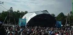 The festival in later years was run over five stages: The Outside Stage was by far the largest and hosted the bigger bands, in conjunction with the Indoor Stage, the main auditorium of the De Montfort Hall. In addition, The Musician Stage was a tent featuring mainly acoustic and roots music at times when the Outside stage is quiet, and The Rising Stage featured new and local talent. In 2006 the eFESTIVALS Cabaret Stage was added, and these were added to in 2008 by the Phrased & Confused/Bathysphere tent, offering spoken word performances during the day and electronica artists later on. In 2012, the Musician Stage and the Rising Stage were replaced by two new performance spaces in The Village, named the Into the Wild stage and the Watering Hole following the festival's safari theme.