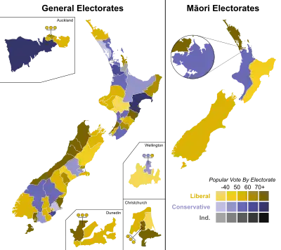 The following table gives party strengths and vote distribution according to Wilson (1985), who records Maori representatives as Independents prior to the 1905 election.[5]