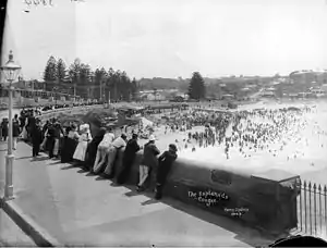 People generally agreed with strict regulations about dress but the idea of men wearing women's clothing was "going altogether too far", especially as male bathers were considered the "most manly of men" and sea-bathing both pleasurable and healthy.[13] The "skirt" ordinance and the consequent demonstrations culminated decades of protest from conservative beach goers who decried the 'exhibitionism' of scantily clad surf bathers. However, the demonstration against the proposal by three Sydney mayors to introduce skirted bathing costumes on Sydney's main beaches showed the resistance particularly of middle-class men who were members of the newly established Surf Bathers Association of New South Wales.[14]