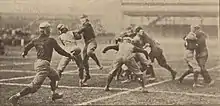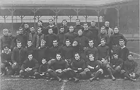 In July 1908, the Western University of Pennsylvania officially became the University of Pittsburgh. Hence, the cheers and songs emanating from the students at sporting contests had to be changed for the 1908 football season.[13] In April, John A. Moorhead was hired to lead the football team for a second season.[14] He hired ex-quarterback Karl Swenson as assistant coach. At the 1907 season ending banquet Quince Banbury was chosen captain by his teammates.[15] The drama in this offseason centered on a request by Washington & Jefferson University's Athletic Committee for the Western University of Pennsylvania to sign an agreement to adopt a one-year residency rule for their athletes. They stated that they would only make this request of the Western University of Pennsylvania. The WUP Athletic Committee declined and severed ties with all Washington & Jefferson athletic teams.[16] Late in November the Red and Black changed their mind and begged for a post season football game with the University of Pittsburgh. The details were worked out between Alexander Silverman, the graduate manager of athletics at Pitt and E. M. Murphy, the graduate manager of athletics at Washington & Jefferson. The University of Pittsburgh Athletic Committee agreed to mend relations with the Red and Black and the eleventh game was added to the schedule. The main plus to come out of the pettiness and then total reversal shown by Washington & Jefferson's Athletic Department was a rivalry played for the next twenty-one straight years.[17] In its second season under head coach John A. Moorhead, the team compiled an 8–3 record and outscored opponents by a total of 140 to 36.[18][19] At the conclusion of the season Mr. Moorhead resigned as coach and went into business with his father.[20]