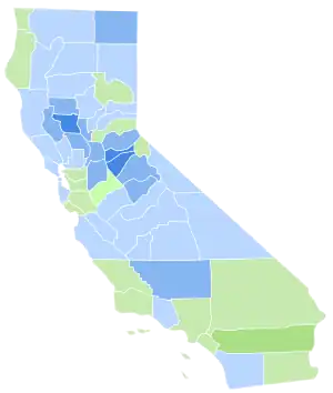 Although Wilson narrowly failed to win the state, he did become the first Democrat to carry Napa, Solano[lower-alpha 3] and Marin Counties since James Buchanan in 1856, the first to carry Sacramento County and Sierra County since Stephen A. Douglas in 1860, the first to win San Diego County since 1868, the first to ever carry Ventura County, which had been created in 1872, and the first to carry Sutter County since 1876.[4] Since this election, Solano County has voted Democratic in all but six Republican landslide elections of 1920, 1924, 1928, 1972, 1980 and 1984.