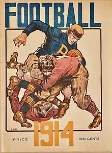 The University of Pittsburgh Athletic Council published the seventy-two page Fifth Annual Football Year Book for use as the 1914 game day program. The cover illustration was done by Rowland R. Murdoch, illustrator for the Pittsburgh Press.[23]
