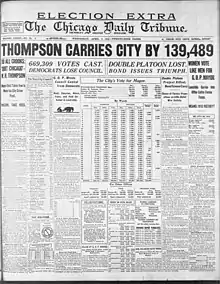 Thompson defeated Sweitzer by greater than an 11% margin.[20] In terms of the number of votes, Thompson's margin of victory was greater than any prior Chicago municipal election.[9][21] The number of votes Thompson received was more than any other candidate for mayor of Chicago had received, up to that time.[6] Thompson won 25 of the city's 35 wards.[9] Thompson's victory had coattail effect on coinciding municipal races.[21]