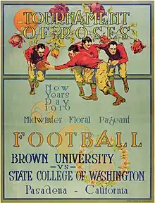 The first game, the 1902 Tournament East-West football game, was so lopsided that for the next 13 years, the Tournament of Roses officials ran chariot races, ostrich races, and other various events instead of football.[2] But, on New Year's Day 1916, football returned to stay as undefeated Washington State College defeated Brown University in this first annual Tournament of Roses football game.