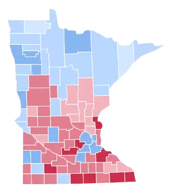 Wilson's performance was the closest any Democrat had come to carrying the Republican stronghold of Minnesota since Minnesota's statehood inception in 1858[1] – he was almost five percent ahead of his losing margin in 1912 when the state was won by Progressive Theodore Roosevelt. Wilson comfortably won the urban counties of Ramsey, Hennepin, and St. Louis, which became rigid strongholds for the Democratic Party. Wilson also led Hughes in the socialist strongholds of the forestry- and mining-dominated northern counties. Nevertheless, Hughes won the state with the dominance of the farming districts in the south and his ability to carry fifty-three of eighty-seven state counties. Wilson was however the first Democrat to ever carry Lake, Kandiyohi, Saint Louis, Norman, Todd, Lyon, Murray and Martin Counties,[2] the first to carry Carlton County since Winfield S. Hancock in 1880, and the first to win Hubbard County since Grover Cleveland in 1888.[2]