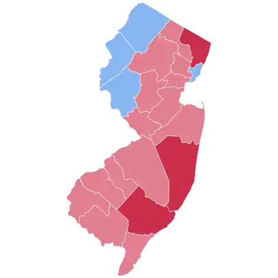 On the county level map, reflecting his comfortable victory, Hughes carried 17 of the state's 21 counties, breaking sixty percent of the vote in three. Wilson's only significant win was urban Hudson County, while he also won the three rural counties in western North Jersey, Warren, Sussex, and Hunterdon, which had long been non-Yankee Democratic enclaves in the otherwise Republican Northeast.[2] Warren and Hunterdon had never voted Republican as of 1916 – and Sussex only for William McKinley in 1896 – yet Wilson would prove the last Democrat to win Sussex County until Lyndon Johnson in 1964.[3]
