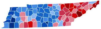 For over a century after the Civil War, Tennessee was divided according to political loyalties established in that war. Unionist regions covering almost all of East Tennessee, Kentucky Pennyroyal-allied Macon County, and the five West Tennessee Highland Rim counties of Carroll, Henderson, McNairy, Hardin and Wayne[1] voted Republican – generally by landslide margins – as they saw the Democratic Party as the “war party” who had forced them into a war they did not wish to fight.[2] Contrariwise, the rest of Middle and West Tennessee who had supported and driven the state’s secession was equally fiercely Democratic as it associated the Republicans with Reconstruction.[3] After the disfranchisement of the state’s African-American population by a poll tax was largely complete in the 1890s,[4] the Democratic Party was certain of winning statewide elections if united,[5] although unlike the Deep South Republicans would almost always gain thirty to forty percent of the statewide vote from mountain and Highland Rim support.