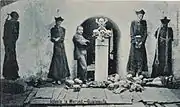 It was at the Guatemala City General Cemetery that the devastation was most evident: all was demolished on the night of the earthquake and it was said that about eight thousand dead were shaken from their graves, threatening pestilence to the city and forcing the authorities to burn all of them in a gigantic bonfire.[8] The empty tombs were still open in 1920 and no attempt had been made to restore the cemetery to its original condition.[8]