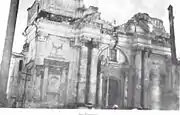 Public buildings, schools, churches, the theater, and museums were all in the hopeless state of desolation in which they were left by the earthquake. Bits of roof hung down the outsides of the walls and the footway was littered with heaps of stucco ornaments and shattered cornices. A payment of some hundred dollars would ensure that a house that had been marked as insecure with a black cross was then deemed as done with its necessary repairs, allowing the owners to leave the houses empty and in ruins.[8]
