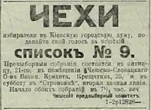 Ukrainian parties won a fifth of the seats in the City Duma.[6] 10 out of the 24 deputies for the Ukrainian socialist list were Ukrainian Socialist-Revolutionaries.[3] The General Jewish Labour Bund got 7 of the 44 seats won by of the Menshevik-SR-Bund list, Moisei Rafes being one of the Bundist deputies.[7][13][8] Mikhail Balabanov was one of the Menshevik deputies.[14] Georgy Pyatakov was one of the Bolshevik deputies.[15] Ipolit Fialek, leader of the Polish section of the Kiev City Bolshevik Committee, was one of the elected deputies.[16][17] Kazimierz Domosławski was the deputy of the Polish Socialist Party in the city duma.[18][19]