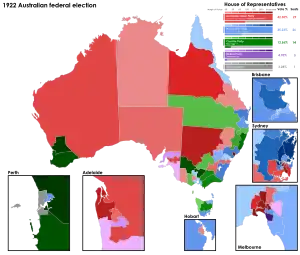 The 1922 Australian federal election was held in Australia on 16 December 1922. All 75 seats in the House of Representatives, and 19 of the 36 seats in the Senate were up for election. The incumbent Nationalist Party, led by Prime Minister Billy Hughes lost its majority. However, the opposition Labor Party led by Matthew Charlton did not take office as the Nationalists sought a coalition with the fledgling Country Party led by Earle Page. The Country Party made Hughes's resignation the price for joining, and Hughes was replaced as Nationalist leader by Stanley Bruce.
