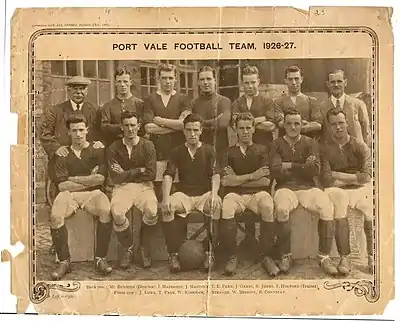 In the FA Cup, Vale made it through to the Fourth Round after taking Clapton Orient to a replay. This came just two weeks after playing the club twice during the Christmas period.[1] They then faced First Division Arsenal, and following a draw at The Old Recreation Ground, the "Gunners" won 1–0 at Highbury, before going on to lose in the final.[1] Vale's hard work in the tournament earned them over £4,000 in gate receipts.[1] On 5 May 1927, Vale played Potteries derby rivals Stoke City in the North Staffordshire Royal Infirmary Cup, and lost an embarrassing 5–0 to the Third Division North champions.[1] However, £365 was raised for the local hospital.[2]