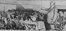 The Chicago Federation of Labor endorsed Thompson.[51] Margaret Haley, president of the Chicago Federation of Teachers, personally endorsed him as well.[51] The Cook County Wage-Earners' League ran an advertisement for Thompson in the Chicago Tribune, in which it claimed that 95 percent of the trade unions in Chicago endorsed him.[67] However, in actuality, labor support was divided between the two major party candidates. While the Cook County Wage Earners, headed by Chicago Federation of Labor vice-president Oscar F. Nelson, backed Thompson, a notable group of labor officials also backed Dever. Among those backing Dever were Chicago Federation of Labor president John Fitzpatrick and Illinois State Federation of Labor secretary Victory A. Olander.[68] Dever also received the endorsement of the union representing the city's transit employees (workers on its streetcar and elevated lines).[69][70]