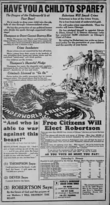 - 1 2 3 "Advertisement "Ask Your Neighbor! The Answer Is 7 Times out of 10 John Dill Robertson Who Is the Best Man For Mayor?"". Chicago Tribune. April 1, 1927. Retrieved January 15, 2022 – via newspapers.com.