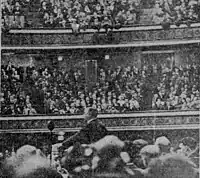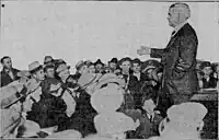 Supporters of both Thompson and Dever resorted to bigotry.[52] Some Republicans used anti-Catholic rhetoric against Dever.[52] Despite Dever also having had a positive relation with black residents of the city,[58] some Democrats attempted to take advantage of Thompson's particularly positive relation with the city's African-American community in order to divide voters racially,[59] claiming that Thompson's election would lead to "Negro supremacy".[52] Palm cards were circulated with an image of Thompson kissing a black boy and with the reverse side reading "Thompson—Me Africa First".[60] Some Democrats hired black people to canvass white neighborhoods for Thompson in an effort to scare white voters.[60] They also attempted to lure black Thompson voters downtown, where they did not often go, with a fake rally outside of Thompson's campaign headquarters.[60] Additionally, the song "Bye Bye Blackbird" was sung at some Dever rallies. Dever supporters also mocked Thompson and his supporters by having a Black man dress up as Paul Revere ride on horseback through the Chicago Loop shouting "The British are coming."[61] Supporters of each candidate accused the other's supporters of plotting to use underhanded tactics to steal the election.[52] In the closing day of the campaign, Dever and Thompson accused each other of attempting to incite a race riot among the city's Black populace.[62]