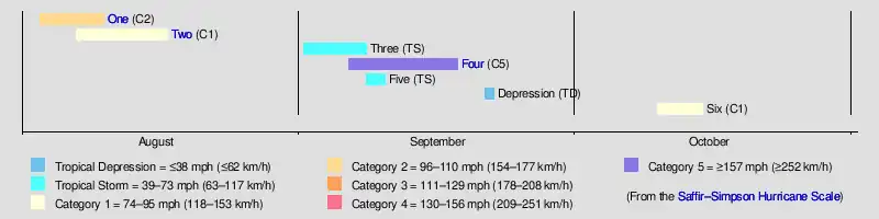 The season's activity was reflected with an accumulated cyclone energy (ACE) rating of 83,[1] slightly above the 19211930 average of 76.6.[2] ACE is a metric used to express the energy used by a tropical cyclone during its lifetime. Therefore, a storm with a longer duration will have high values of ACE. It is only calculated at six-hour increments in which specific tropical and subtropical systems are either at or above sustained wind speeds of 39 mph (63 km/h), which is the threshold for tropical storm intensity. Thus, tropical depressions are not included here.[1]
