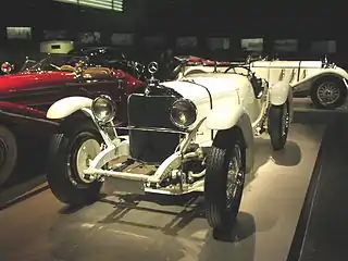 The first German car to run at Le Mans was a privateer entry. Mercedes and Benz had merged in 1926 and had considerable racing success, but with the Depression the company closed its works racing team. Team manager Alfred Neubauer, however, convinced the board to bankroll a privateer team. This was run by their top works driver Rudolf “Rudi” Caracciola. The SSK (Super Sports Kurz) was designed by Ferdinand Porsche as a development of the SS model. The giant 170 bhp 7.1-litre engine could be augmented by a Roots supercharger to put out 300 bhp.[8] However, unlike the Bentleys, the supercharger was not designed to be run all the time (not least for reasons of chronic fuel consumption), and the team was able to convince the ACO to discount the 1.3 supercharger modifier when dictating the car's target distance.[8] Caracciola's co-driver was also from the Mercedes-Benz works team, Christian Werner.