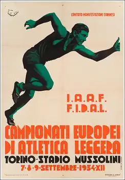 The 1st European Athletics Championships were held in Turin, Italy, at the Stadio Benito Mussolini between 7 and 9 September 1934. A contemporaneous report on the event was given in the Glasgow Herald.[1]