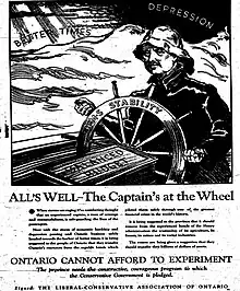 The campaign was brief and bitter, and both sides gained ammunition to use during that time.[2] The Liberals were helped by the effects of the Great Depression, in much the same manner as their colleagues in the recent elections in Nova Scotia, British Columbia and Saskatchewan.[lower-alpha 1][2] They also aggressively pledged to reduce the cost of government once in office,[3] and downplayed the issue of temperance, by pledging to bring recently passed amendments to liquor legislation[4] into force as soon as they attained office.[5]