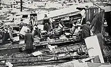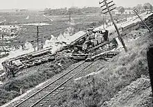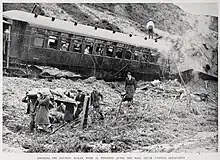The North Island Main Trunk express with 70 passengers on board was travelling at 80 kilometres per hour (50 mph) when it struck a slip 400 metres (1⁄4 mi) south of the Paraparaumu Railway Station at 6:25 a.m. on 30 August 1936.[2][3] The train fell down a three-metre (10 ft) embankment onto its side, coming to rest a few metres from the road running alongside the railway line.[1] Five carriages came off the rails. The roof of the first passenger carriage was torn off and the walls fell onto the track. Passengers were temporarily trapped inside.[1] The engine was half buried in the mud, and debris was thrown onto the road.[2] Both second and third cars were completely derailed and had their trailing bogies torn off. The fourth and fifth cars derailed, but their trailing bogies were not torn off. The following cars did not derail but were badly damaged, and two cars became locked together. A sleeping car, two vans, a postal van, and a "Z wagon" (covered goods car[4]) were undamaged.[5]