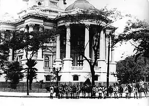 On the morning of 10 November 1937, cavalry of the Federal District police force surrounded the Congress and blockaded the entrance, preventing congressmen from entering.[75] Dutra was against using the Army in this operation.[42][75] One visitor trying to get into the Monroe Palace, the former seat of the Senate, was told by a guard, "When a senator cannot enter, then how can a stranger enter?"[76] As the congressmen were the best paid officials in the state, Vargas claimed he saved money by sending them home.[22] The president of the Senate was informed of his body's dismissal.[65] At 10:00 a.m., copies of the new constitution were printed and distributed amongst the cabinet; they were asked to sign it. The sole dissident, Odilón Braga, the minister of agriculture, resigned immediately and was replaced by anti-Oliveira paulista Fernando Costa.[53][65][77] Dutra, meanwhile, praised the "lofty mission entrusted to the national armed forces".[78] Many military personnel resigned, notably Colonel Eduardo Gomes.[78] Almost every state retained their pre-coup interventors, notably Minas Gerais, where Valadares was the politician most involved with the coup. Interventors in Rio Grande do Sul, São Paulo,[lower-alpha 5] Rio de Janeiro, Bahia, and Pernambuco, however, were replaced.[78]