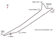 The first San Remo Grand Prix was a non-championship event, held on July 25, 1937, for 1500 cc Voiturette class Grand Prix cars[1] and ran counter clockwise on a 1.862 km (1.157 m.) street circuit in the town of San Remo, known as the San Remo Circuit (Circuito di San Remo, official name: Circuita Stracittadino di San Remo)