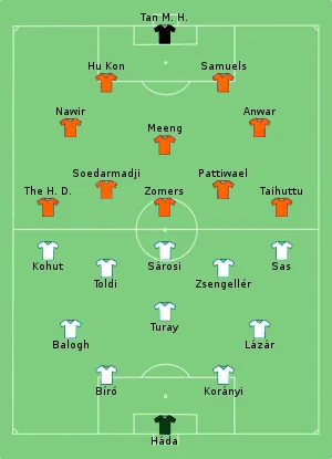 The difference in strength between the two teams was evident as the game resulted in a humiliation for Indonesia (Dutch East Indies), which managed to hold out for just 13 minutes. In the second half, although Hungary relaxed their pressure, they were never truly troubled by the opponents.[2]