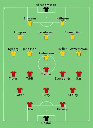 Sweden took the lead after just 35 seconds, but that remained the only goal scored by them. Hungary quickly settled in control of the game, scoring thrice before half-time. Sweden, who had impressed in previous games, could not resist the vastly superior opponent, who scored two additional goals in the second half, cruising towards the final after a comfortable win.[2]