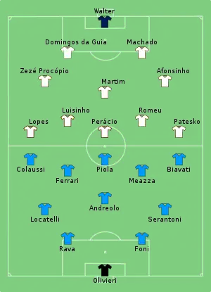 The narrative leading to this highly anticipated match was built around an overconfident Brazil, who had impressed in the previous three matches. However, Italy had a better start to the game, creating the best chances but finding a well-positioned Walter stopping their attacks. In the second half, Italy soon found the net with Colaussi, before being awarded a penalty following a foul in the box by Domingos da Guia, his third in the tournament. The penalty was calmly converted by Meazza. At 2–0, Brazil pushed forward to break the Italian defence, but only managed to score a goal in the 87th minute with Romeu scoring from a corner kick. Some tense moments followed, but Italy managed to hold out for the remaining time, reaching their second final in a row.[2]