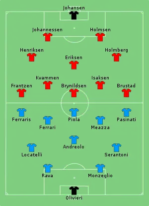 Mindful of the game played against Norway at the semi-finals of the 1936 Summer Olympics, when Italy managed to scrap a win only during extra time, Vittorio Pozzo was not to be overconfident. Italy managed to grab an early lead with Pietro Ferraris, but struggle to threaten Norway's goal further besides hitting the post once. In the second half, Norway was the better team, hitting the woodwork thrice and finally drawing level in the 83rd minute. Soon inside the extra time, Silvio Piola converted in goal a rebounded shot. Italy managed to hold out for the remaining time, reaching the quarter-finals.[2]