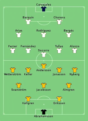The result was never in doubt as Sweden was more accustomed to playing at this level. Gustav Wetterström netted a hat-trick before half-time, with the Cubans unable to deal with the relentless Swedish forward play, especially after Joaquín Arias was forced to leave the pitch injured. Tomás Fernández missed a penalty for Cuba.[2]
