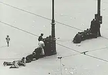 The 1945 shooting on Dam square took place during the liberation of Amsterdam on 7 May 1945, in the last days of World War II in Europe. German soldiers fired machine guns into a large crowd gathered on Dam square to celebrate the end of the war, killing over 30 people.