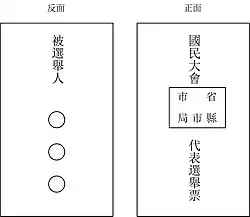 | National Assembly delegate | Exercise political powers on behalf of citizens | Directly elected by citizens of county-level divisions | Institution de facto suspended, with its powers transferred to the Legislative Yuan and referendums | 1947 Chinese National Assembly election |