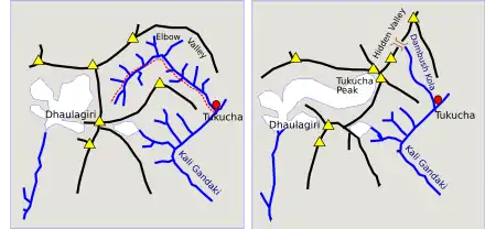 Starting from Tukusha, the climbers Lachenal and Rébuffat headed for an initial exploration of Dhaulagiri's eastern glacier, while Herzog, Terray and Ichac went to the north where they found their 1920s map was seriously defective (see above).[30] Unlike Annapurna, Dhaulagiri is well separated from its neighbouring peaks and it is steep on all sides.[31] They found an unmapped region they called the "Hidden Valley" but from there they were unable to see the mountain at all. Over the next two weeks small groups examined the southeast and northeast ridges while Terray and Oudot reached a 5,300-metre (17,500 ft) pass (called French Pass) beyond the Hidden Valley but, although they were able to see Dhaulagiri, they decided the north face could not be climbed.[30] They were also able to see across to Annapurna in the distance where there were steep cliffs to the south but the northern profile did not look to be more than 35°.[32]