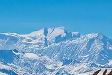 Annapurna Himal from 50 kilometres (31 mi) north. Annapurna I is the highest peak, somewhat left of centre (annotated image).